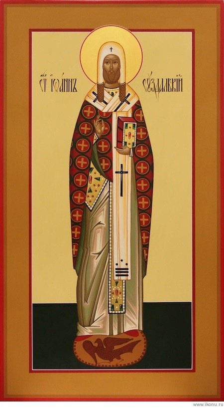 Sainted John, Bishop of Suzdal', entered one of the monasteries of Suzdal' in his youthful years. For his virtuous and humble life, the saint was made the first bishop of Suzdal' and Nizhegorod in 1350. Bishop John merited a great mercy of God: during the time of Divine Liturgy the Suzdal' prince Boris Konstantinovich saw, how an Angel of God attended the saint. Saint John was known for his love towards the destitute and the sick; for the poor he interceded before the princes about an amelioration of taxes, and for the sick he built poor-houses and hospices. The saint was much concerned about enlightening the pagan Mordvians with the Christian faith. After the annexation of Suzdal' to the Moscow metropolitanate, Saint John took the monastic schema and withdrew to the Bogoliubsk monastery. He lived there in seclusion and died peacefully. Numerous miracles were witnessed to at the grave of the saint.