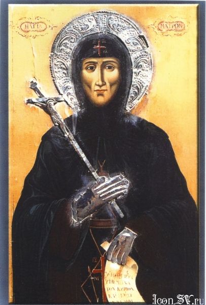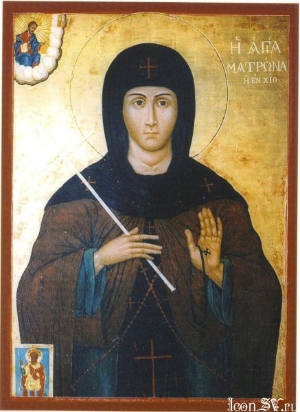 Saint Matrona was born in the village of Volissos on Chios of wealthy and pious parents, Leon and Anna sometime in the fourteenth century. From her youth she showed an inclination for monasticism. One day she left her parents and went to live in an unpopulated area, where she founded a small monastery for women. Soon other nuns joined her in her ascetical struggles.