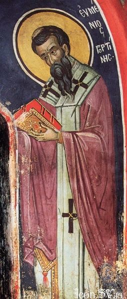 Χαίροις ὁ τῆς Γόρτυνος ποδηγός, καὶ τῆς Κρήτης πάσης, ὁ ἀκοίμητος ὀφθαλμός· χαίροις τῶν θαυμάτων, ἀκένωτος χειμάρρους, Εὐμένιε τρισμάκαρ, πιστῶν ἀντίληψις.