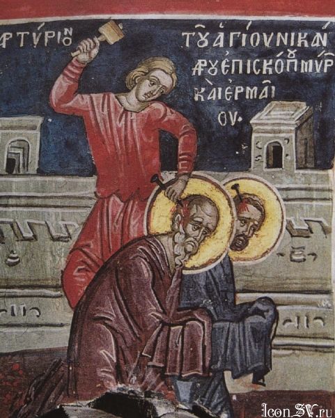 Були учениками послідовника і сподвижника первоверховного апостола Павла святого апостола Тита, були рукоположені ним в священний сан. Подвизаючись в невтомних трудах, святі багатьох язичників навернули до Христа. За це вони були схоплені і приведені на допит до начальника міста Ливанія. Ні умовляння, ні погрози влади не зламали святих мучеників. Нелюдські муки перенесли святі: їх прив’язували до коней, волокли по камінню, тіла їхні рвали залізними гаками, кидали в палаючу піч. Господь допоміг їм перетерпіти, те , що людина своїми власними силами витерпіти не може. Під кінець мучителі прокололи голови і серця святих цвяхами і кинувши їх в яму закидали землею.